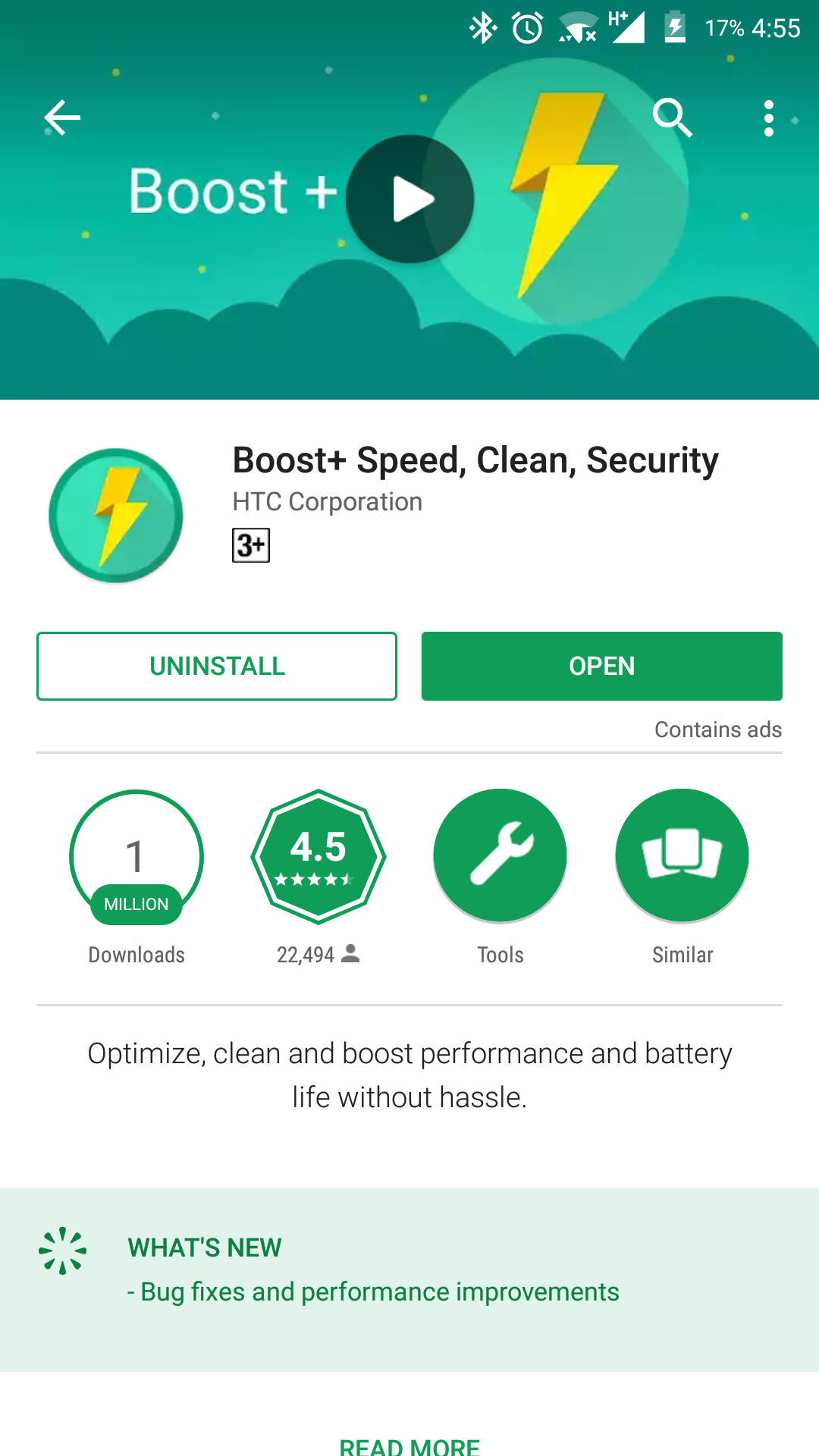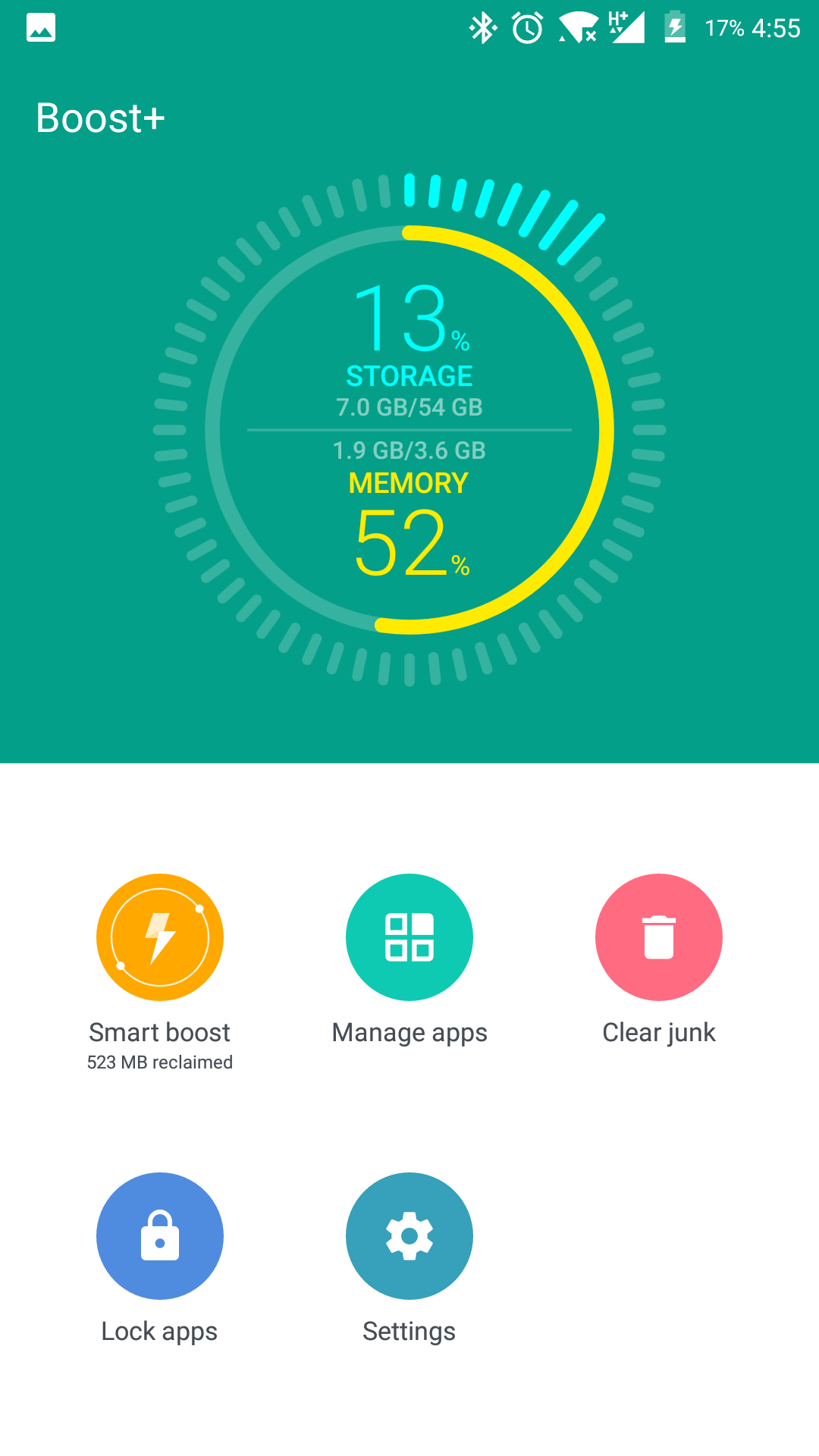 Boost+ là ứng dụng quản lí bộ nhớ, dọn cache, RAM do HTC phát triển. Ứng dụng này có 3 tính năng chính: dọn rác bộ nhớ cache, dọn RAM và bảo mật ứng dụng khác bằng hình vẽ (hoặc vân tay). Giao diện dễ dùng, bắt mắt, tính năng Smart Boost thông minh giúp chúng ta chẳng cần phải mở app thường xuyên, ứng dụng sẽ tự dọn rác cho chúng ta