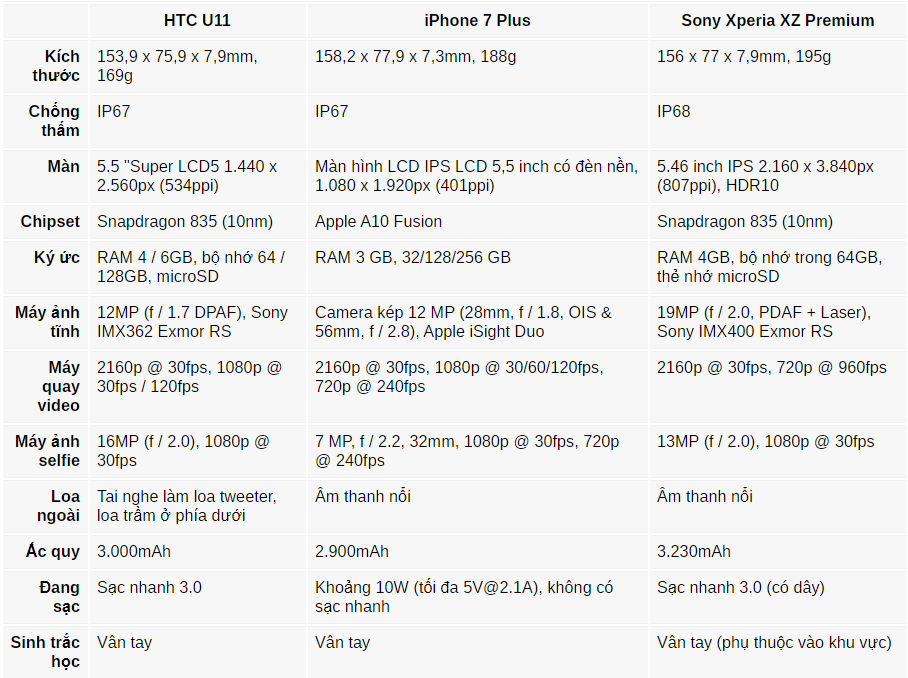 Từ trái sang: HTC U11 - iPhone 7Plus - XZ Premium