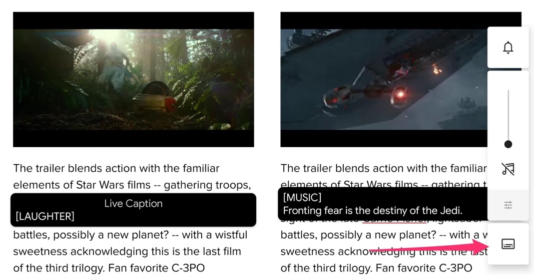 Đặc biệt, bạn có thể kéo và thả tùy thích thanh màu đen này đến vị trí nào trên màn hình. Hay người dùng đều có thể kéo nó xuống cạnh dưới cùng của màn hình để tắt Live Caption cũng được. Bên cạnh đó, bạn có thể điều khiển mở thanh âm lượng và bật/tắt Live Caption với nút chuyển đổi ở dưới cùng này. Tính năng Live Caption tạo phụ đề theo thời gian thực dù bạn có kết nối Internet hay không vẫn đều được. Và đặc biệt là nó không cần gửi bất kỳ dữ liệu nào đến Google để xử lý.