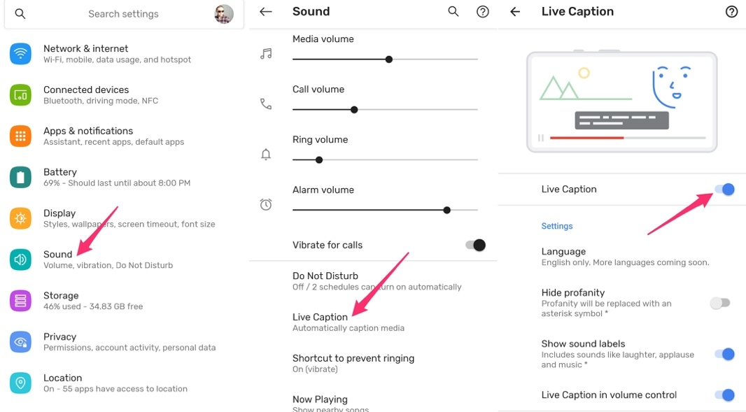 Đầu tiên, sau khi thiết lập trên cả hai máy Google Pixel 4/ Google Pixel 4 XL thì bạn cần bật chế độ Live Caption tại ứng dụng Settings. Bạn chỉ cần truy cập vào phần cài đặt (Settings) tiếp theo là vào Sound sau đó chọn Live Caption. Lưu ý bạn có thể bật nút nằm bên cạnh dòng chữ Live Caption. Và bạn có thể dễ dàng tùy chỉnh chế độ này phù hợp với nhu cầu sử dụng của mình.