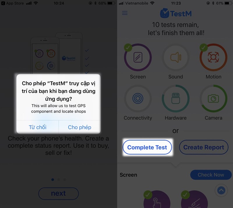 Người dùng có thể kiểm tra từng bộ phận bằng cách chọn từng bộ phận đã hiển thị trên giao diện ứng dụng, hoặc kiểm tra toàn diện smartphone của mình thông qua Complete Test.