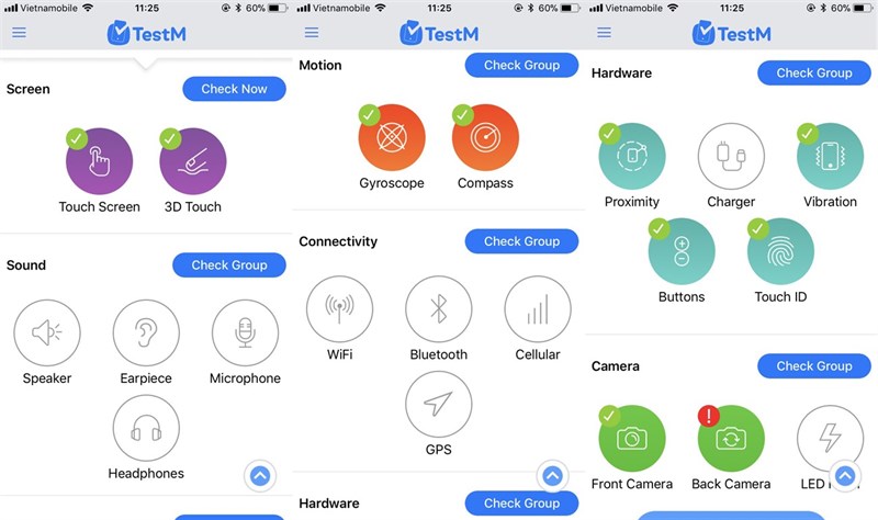 TestM bao gồm 19 bước kiểm tra bao gồm Màn hình (Screen), Âm thanh (Sound), Chuyển động (Motion), Kết nối (Connectivity), Phần cứng (Hardware), Camera.