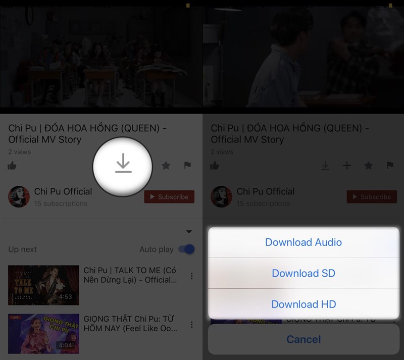 Sau khi đăng nhập thành công, quay lại video và chọn lại nút Tải về. Ngay lập tức người dùng sẽ có 3 tuỳ chọn bao gồm: Download Audio (Tải về file nhạc .m4a), Download SD (Tải về file video chất lượng SD), và Download HD (Tải về file video chất lượng HD).