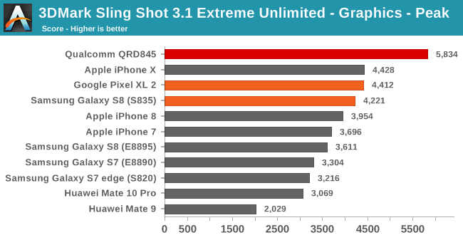 Điểm vật lý là một bài kiểm tra giới hạn CPU và ít bị giới hạn bởi GPU. Ở đây, Snapdragon 845 cung cấp một sự cải tiến tốt hơn so với Snapdragon 835 là 14%.