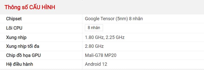 Thông số về cấu hình Google Pixel 6 được tóm tắt trong bảng sau: