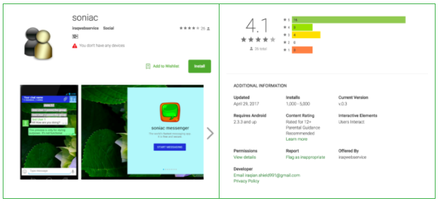 Phần lớn các ứng dụng độc hại bị Lookout tìm ra đều được phát tán trên các kho ứng dụng không chính thống, tuy nhiên có 3 phần mềm chứa mã độc có mặt trên PlayStore, nổi tiếng nhất là Soniac. Nó ngụy trang như một ứng dụng nhắn tin và dựa trên mã nguồn mở Telegram nhưng thực chất lại nghe lén người dùng. Trước khi bị Google chặn đứng, ứng dụng đã có hơn 1.000 lượt tải nhưng nhiều trường hợp là do các bot hoặc thiết bị thử nghiệm của chính kẻ tấn công. Hai cái tên còn lại là Hulk Messenger và Troy Chat có ít lượt tải hơn.