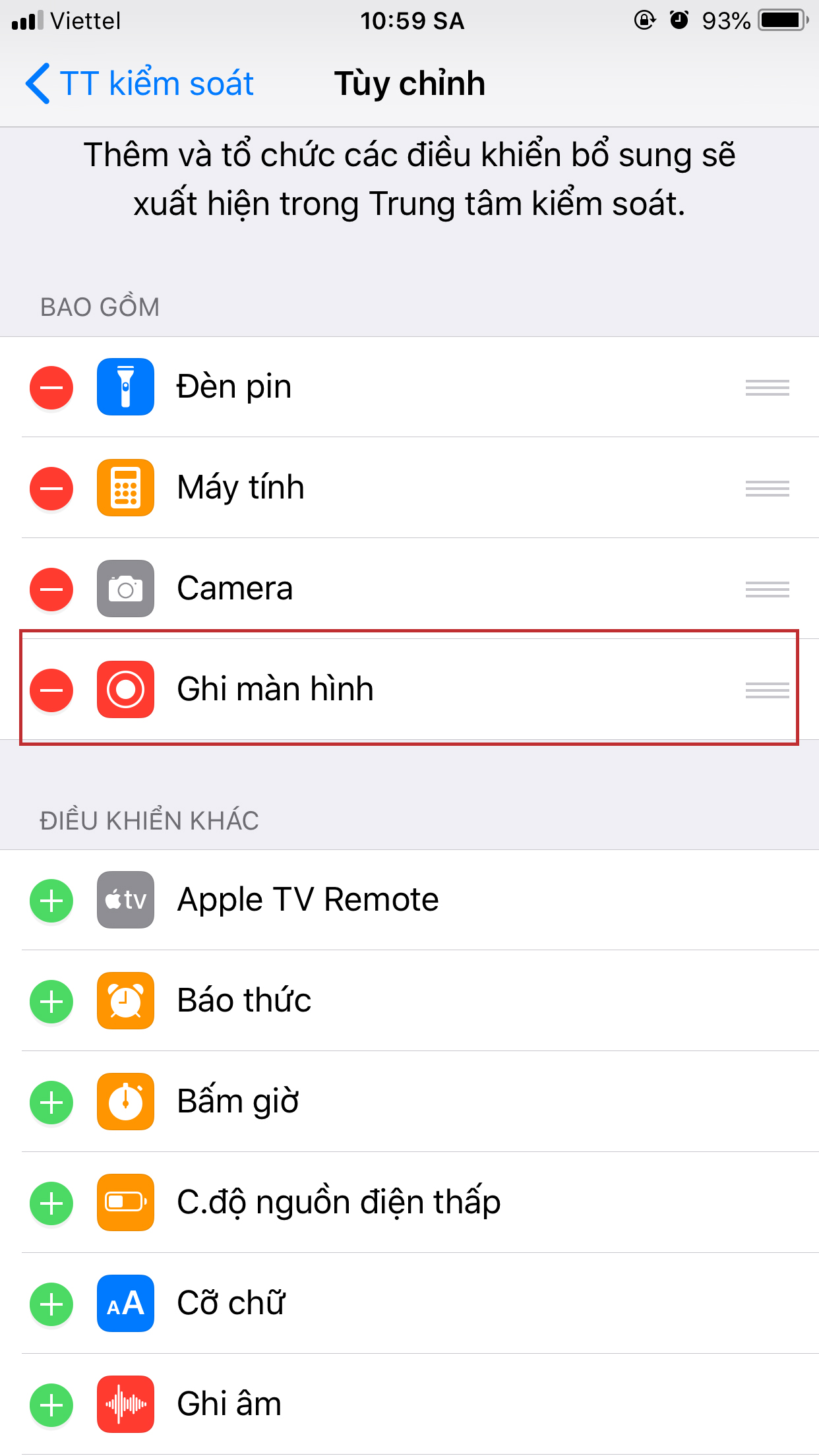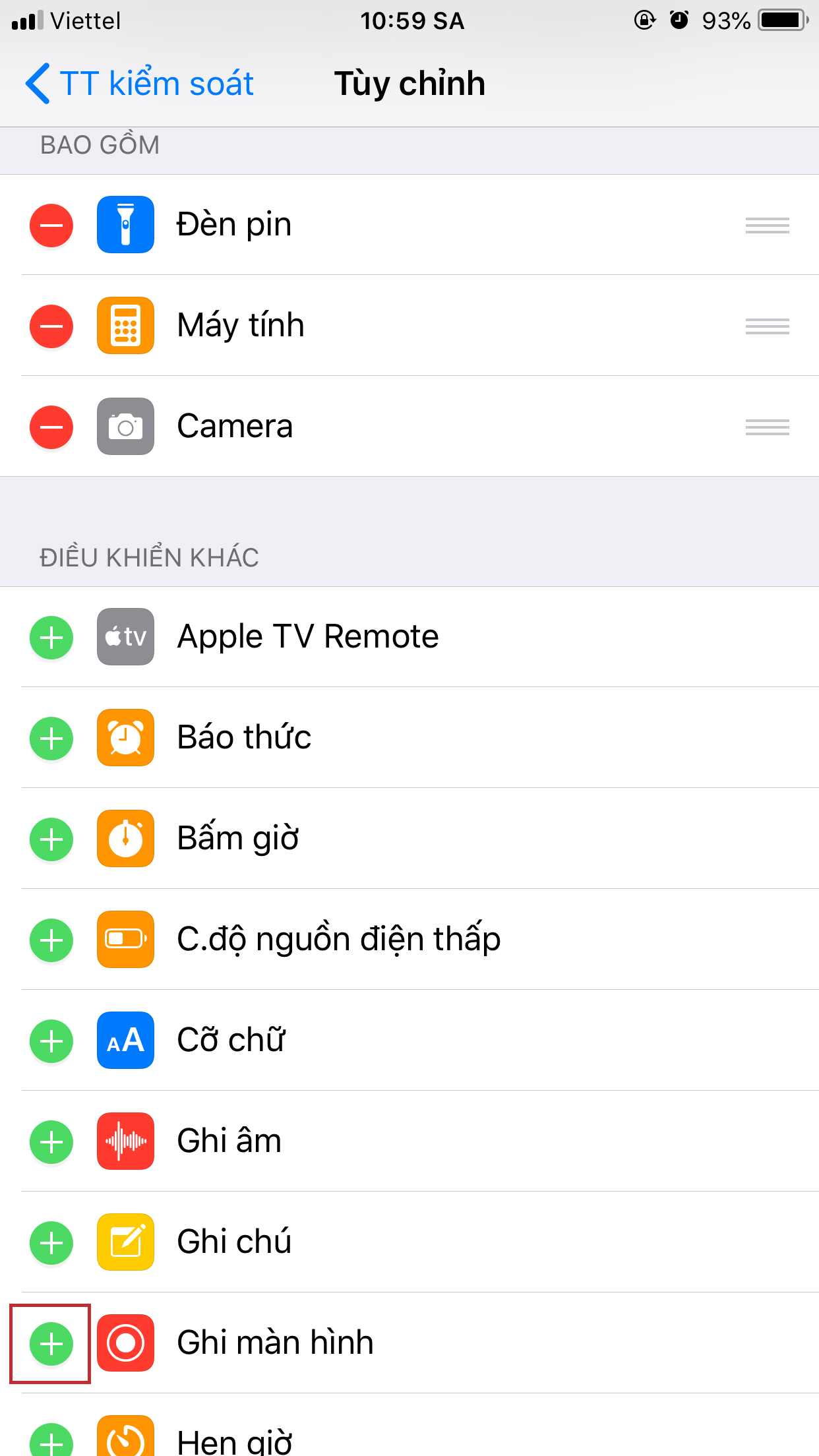 4. Sau khi vào được giao diện tùy chỉnh các bạn ấn dấu + ở trước dòng “Ghi màn hình” để thêm vào control center.