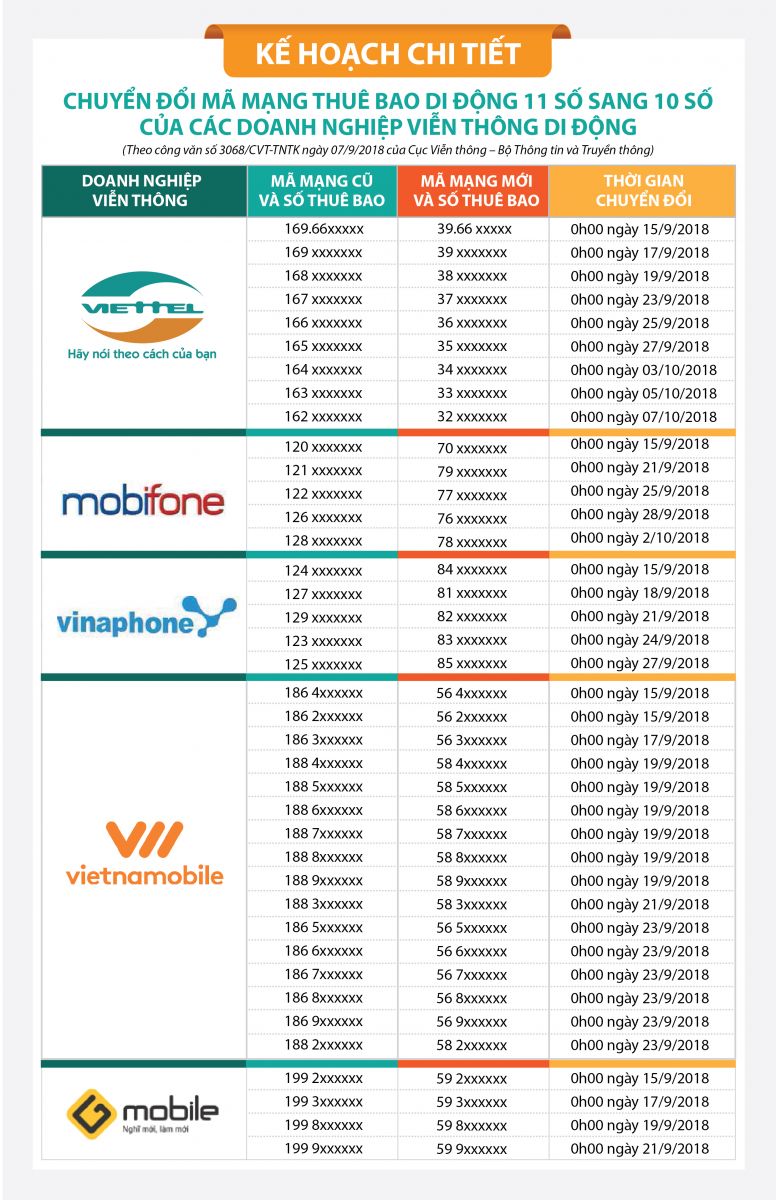 Khi Kế hoạch chuyển đổi mã mạng được triển khai, các nhà mạng sẽ chuyển đầu số một cách tự động. Việc chuyển đổi này được thực hiện vào ban đêm, theo lịch chuyển đổi đã được nhà mạng công bố dưới đây.