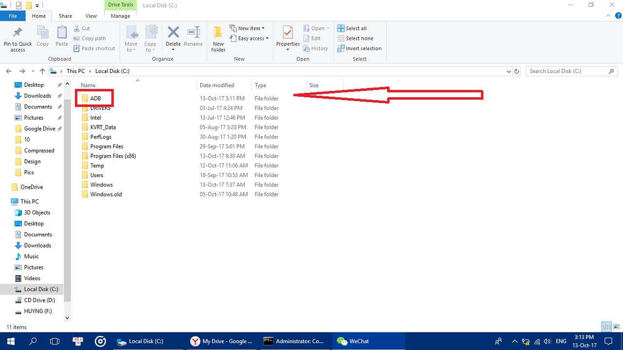 *** Tải file ADB Fastboot TẠI ĐÂY. Sau khi tải về, các bạn tạo 1 thư mục tên ADB tại ổ C như hình