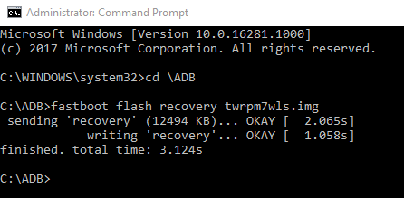 - M7 Quốc Tế: fastboot flash recovery twrpm7ul.img