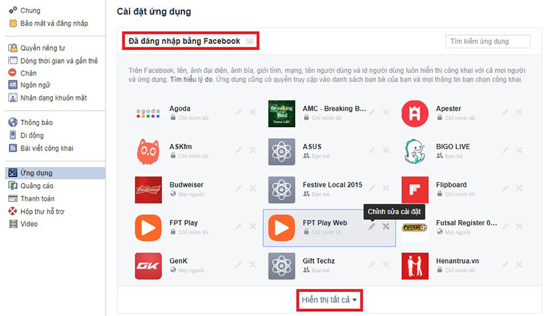 - Trong mục Đã đăng nhập bằng Facebook – Logged in with Facebook, bạn sẽ thấy các ứng dụng theo dõi.