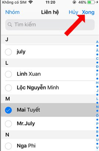 Ngay sau đó giao diện danh bạ trên iPhone xuất hiện. Tích chọn vào những số liên hệ muốn gửi tin nhắn rồi nhấn nút Xong ở góc phải trên cùng. Sau đó phím tắt sẽ tiến hành gửi tin nhắn tới các số đã chọn cùng lúc.