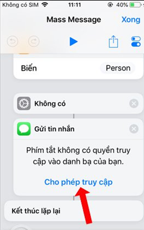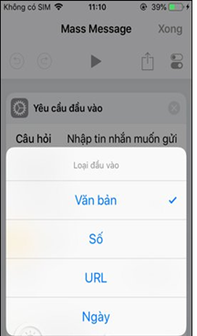 Quay trở lại giao diện Siri Shortcuts rồi nhấn vào phím tắt Mass Message. Lúc này bạn sẽ được hỏi có muốn khởi chạy phím tắt không, nhấn Chạy phím tắt. Xuất hiện giao diện nhập nội dung tin nhắn muốn gửi tới nhiều người.