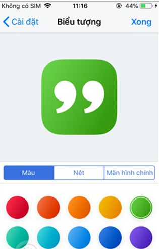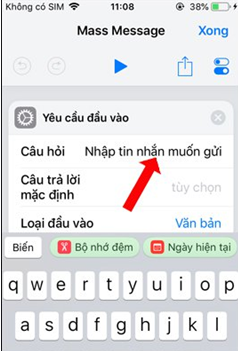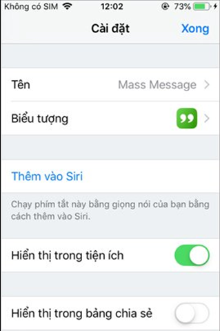 Ngoài ra khi nhấn vào biểu tượng cấu hình bên phải trên cùng sẽ được thay đổi tên phím tắt hoặc biểu tượng phím tắt nếu muốn. Nhấn Xong để lưu lại toàn thiết lập cho phím tắt Mass Message.