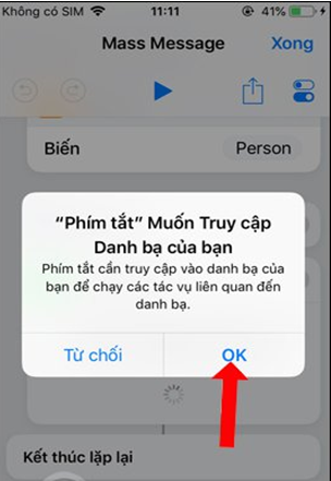 Tiếp tục kéo xuống bên dưới sẽ có phần Gửi tin nhắn, nhấn Cho phép truy cập để phím tắt sử dụng danh bạ trên thiết bị. Nhấn tiếp OK để đồng ý.