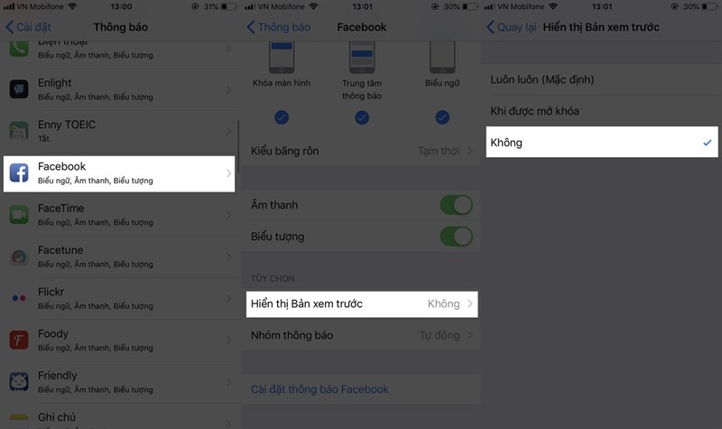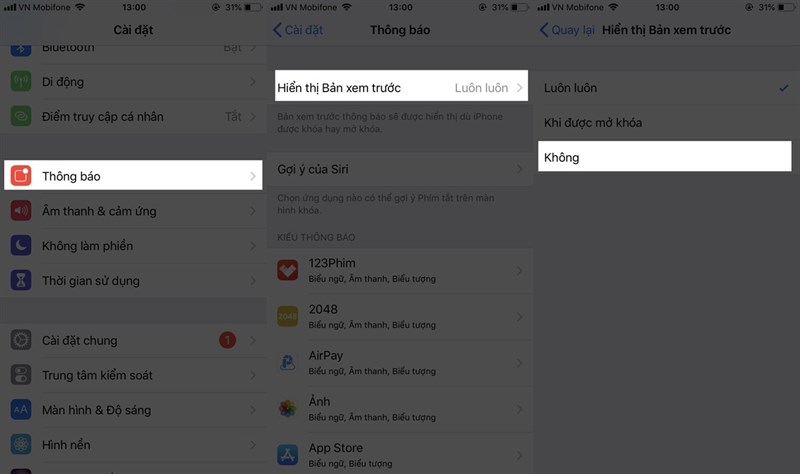 Từ màn hình chính của iPhone, bạn truy cập mục Cài đặt -> chọn Thông Báo. Tìm đến mục Hiển thị bản xem trước và chọn Không hoặc chọn Khi được mở khóa.