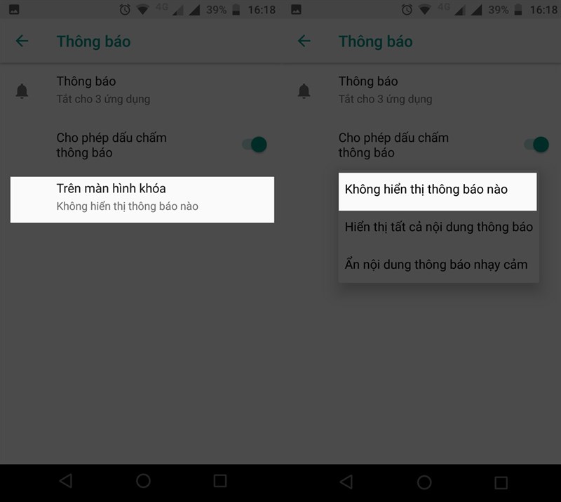 Tại phần Trên màn hình khoá, bạn chọn Không hiển thị thông báo nào để ẩn các thông báo riêng tư. Với cách này sẽ áp dụng với toàn bộ ứng dụng trên smartphone.