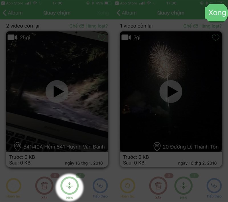 Người dùng sẽ được cung cấp 4 tuỳ chọn chính là: Hoàn tác, Xoá, Nén, Tiếp theo. Chọn một hay nhiều tệp bất kì, nhấn vào Nén. Sau khi đã hoàn tất việc chọn, bạn nhấn vào nút Xong ở góc trái phía trên màn hình.