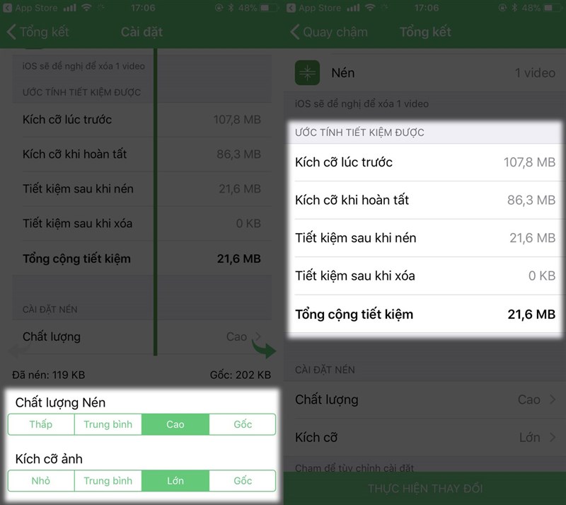 Tại đây, bạn có thể tuỳ chỉnh Chất lượng (Thấp, Trung bình, Cao, Gốc), cũng như Kích cỡ ảnh nén (Nhỏ, Trung bình, Lớn, Gốc). Bên cạnh đó, ứng dụng còn giúp người dùng tính toán dung lượng có thể tiết kiệm được sau khi hoàn tất nén hình ảnh/ video. Và chọn Thực hiện thay đổi.