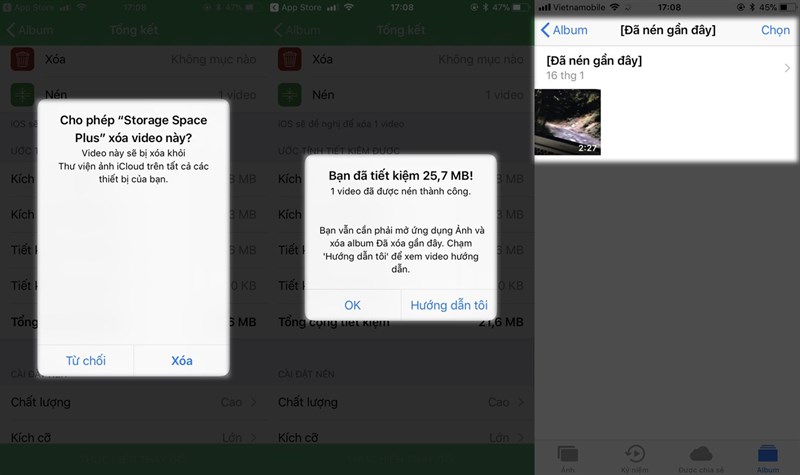 Quá trình nén hoàn tất, Storage Space Plus sẽ hỏi quyền xoá những hình ảnh/ video vừa nén để có thể tiết kiệm dung lượng cho iPhone. Bạn chọn Xoá cũng như truy cập Ảnh > Đã xoá gần đây để hoàn tất việc xoá hình ảnh.