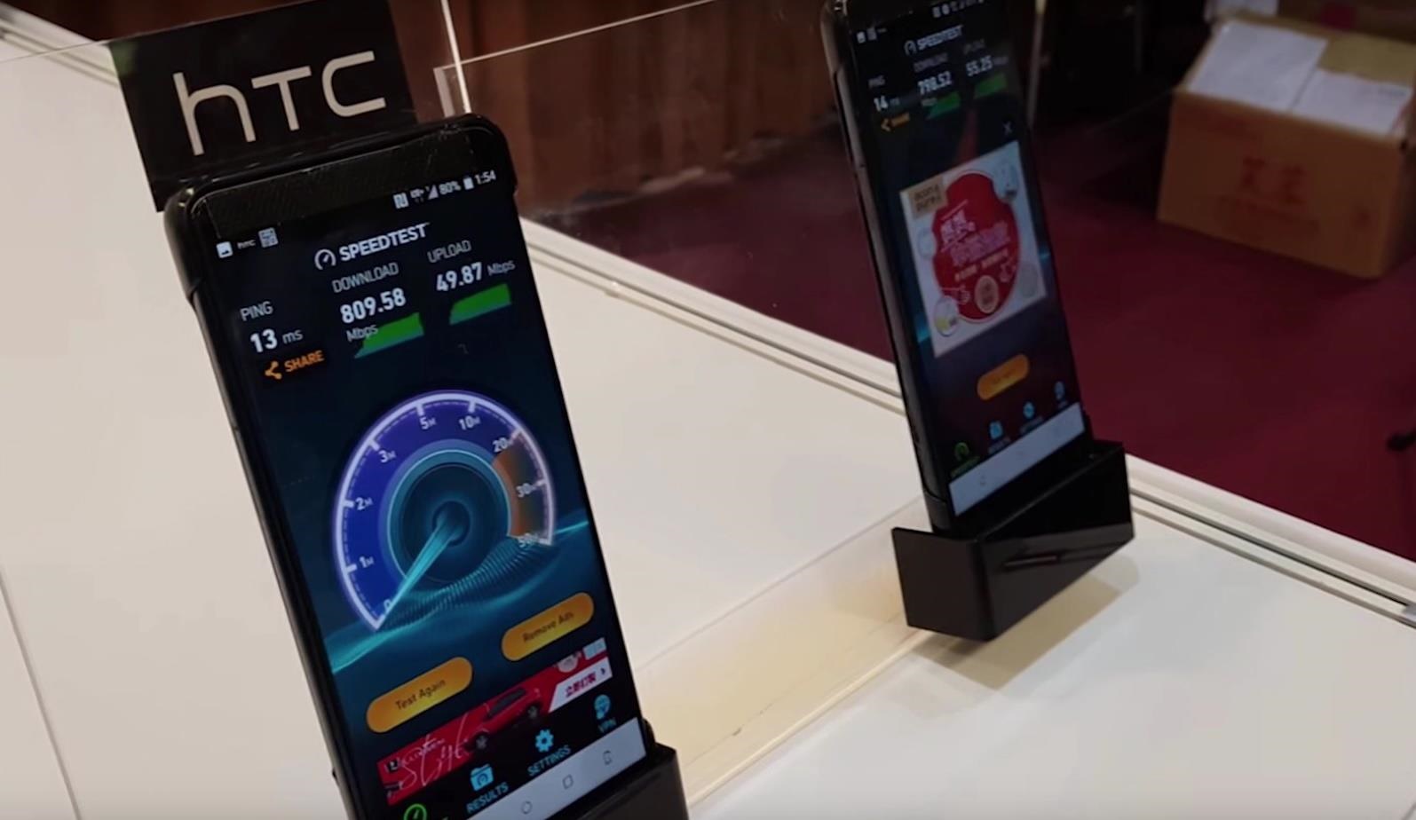 Smartphone được cho là HTC U12 được bày tại sự kiện 5G (Ảnh: Android Central/Youtube)