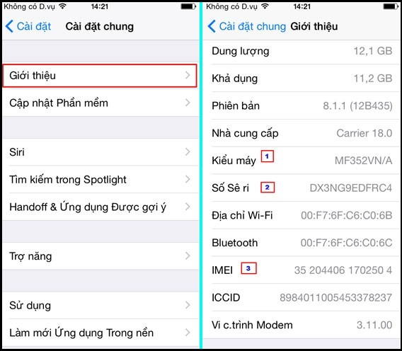 Để kiểm tra nguồn gốc xuất xứ của máy sẽ phải dựa trên "Kiểu máy" và "IMEI". Để xem mục này, bạn vào Cài đặt > Cài đặt chung > Giới thiệu. Tại đây tìm đến mục kiểu máy, để ý đến phần ký tự cuối VN/A, đó chính là mã vùng xuất xứ của thiết bị.