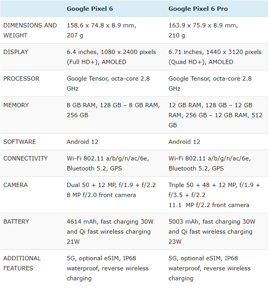 Sự khác biệt giữa hai điện thoại này chỉ đến từ bộ nhớ: Google Pixel 6 có RAM 8GB và bộ nhớ trong 128GB hoặc 256GB tùy thuộc vào cấu hình, trong khi Pixel 6 Pro có 12GB RAM và 128, 256 hoặc 512GB dung lượng lưu trữ. Về phần mềm, bộ đôi smartphone Pixel mới chạy trên hệ điều hành Android 12 mới nhất và chúng sẽ nhận được 5 năm hỗ trợ phần mềm cũng như 3 năm cập nhật Android lớn.