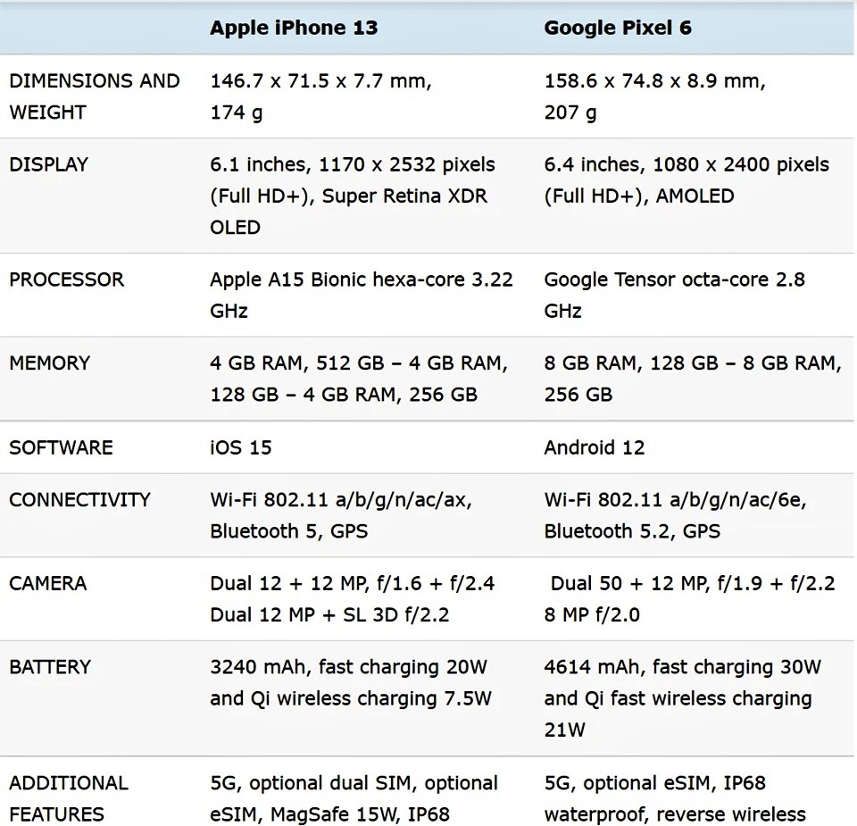 - Về bộ xử lý, Google Pixel 6 là chiếc điện thoại đầu tiên có SoC độc quyền đầu tiên của Google, đó là Google Tensor. Chip Tensor trên Pixel 6 còn Apple A15 Bionic trên iPhone 13.