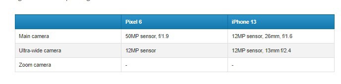 Các thông số về camera giữa Pixel 6 và iPhone 13