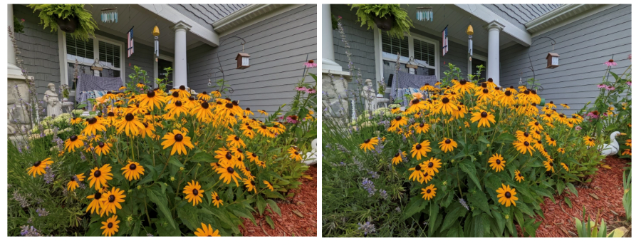 Chuyển sang bức ảnh về những bông hoa màu vàng, chúng ta cũng có kết luận tương tự. Đây đều là những bức ảnh đẹp, có màu sắc rực rỡ, chính xác và góc nhìn rộng không bị biến dạng. Tuy nhiên, trong trường hợp này, Pixel 6 có nhiều chi tiết hơn ở trung tâm của mỗi bông hoa — mặc dù được chụp ở một góc xa hơn một chút.