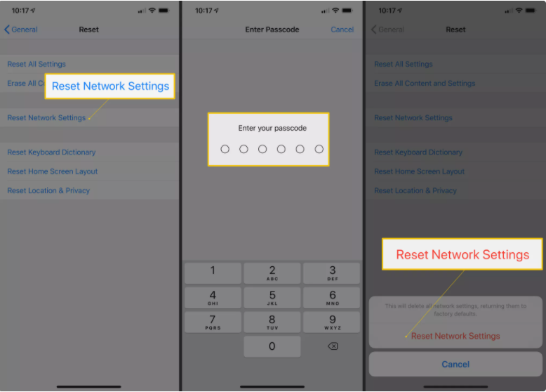 - Chọn Đặt lại Cài đặt Mạng . Nếu bạn có mật mã trên điện thoại của mình, bạn cần nhập mật mã đó trước khi có thể đặt lại.