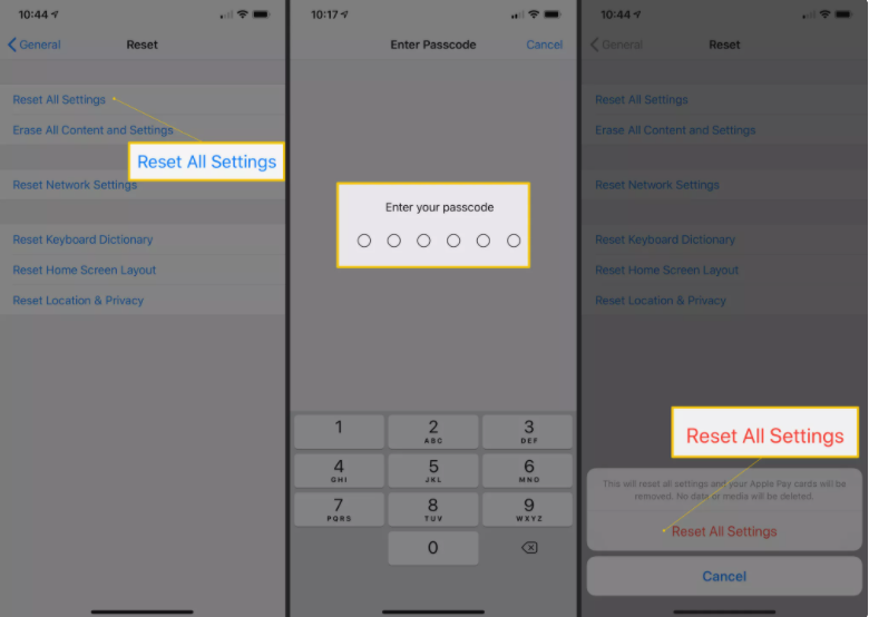 - Đặt lại tất cả cài đặt, nhập mật mã của bạn và đặt lại tất cả cài đặt trên ba màn hình iOS