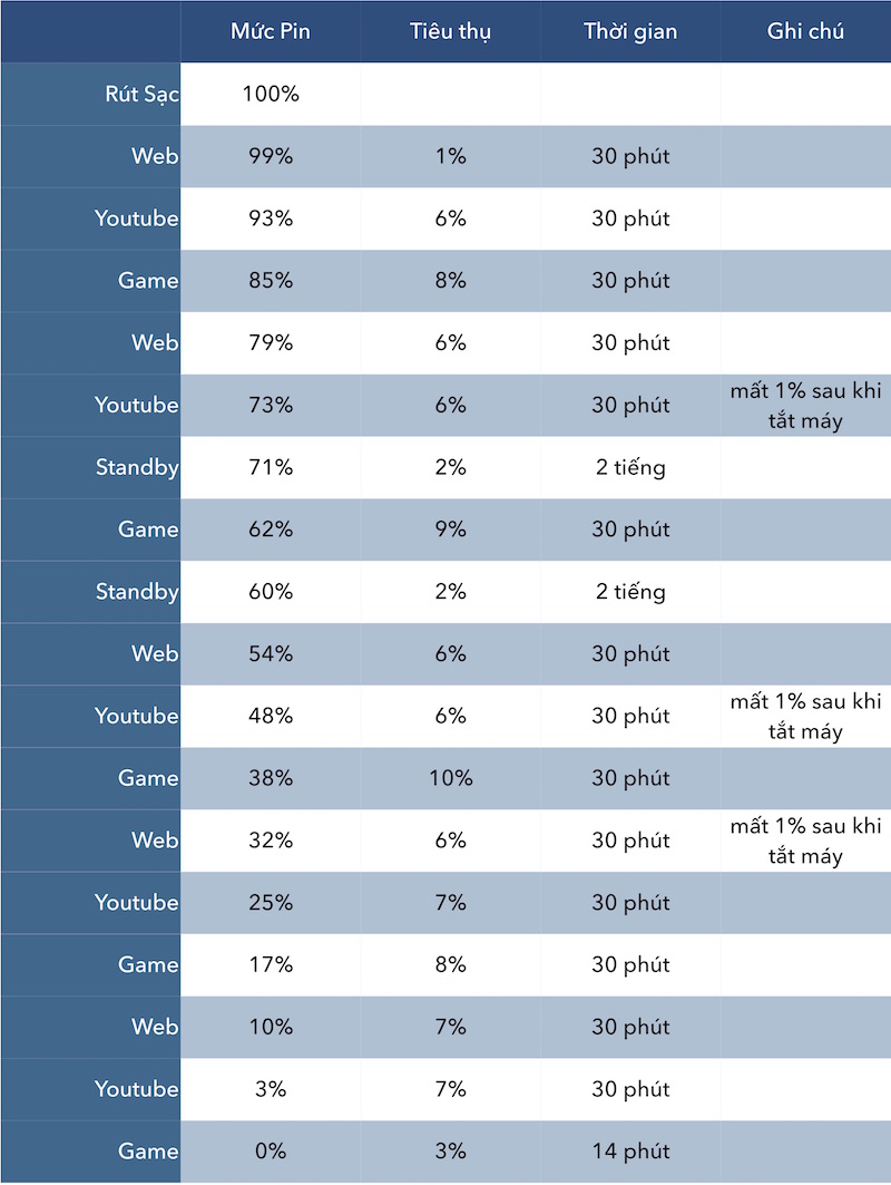 Từ bảng trên các bạn có thể thấy iPhone 6s Plus sẽ sử dụng liên tục sáng màn hình trong 7 tiếng 14 phút và hầu hết đều là các tác vụ tương đối nặng. Nếu bạn là người sử dụng bình thường, ít chơi game thì việc sáng màn hình trên 9 tiếng là chuyện bình thường. Trong khi thử nghiệm người dùng có để 4 tiếng Standby và bị sụt 4% pin.