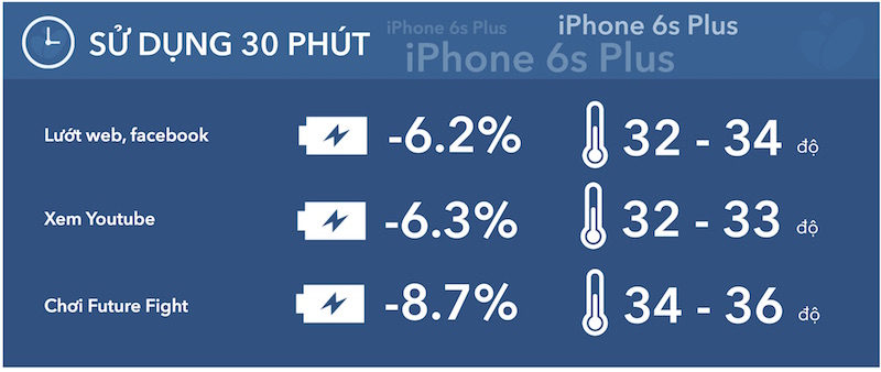Ở bài đánh giá thời gian sử dụng hỗn hợp, iPhone 6s Plus được sử dụng liên tục ở các tác vụ: vào mạng (duyệt web, facebook, chat, imes); xem Youtube; chơi game Future Fight ở chế độ Max Setting (một game hành động của Marvel với đồ họa tuyệt đẹp). Mỗi tác vụ trên sẽ hoạt động liên tục trong 30 phút rồi chuyển đổi cho nhau. Cứ như vậy cho đến lúc hết pin. Kết quả thể hiện ở bảng dưới đây: