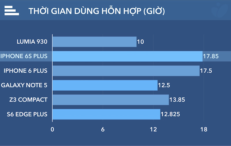Với thời gian Onscreen 7 tiếng 14 phút thì tổng thời gian sử dụng hỗn hợp của iPhone 6s Plus sẽ là 17 giờ 52 phút (bằng thời gian Onscreen nhân với hệ số Standby 2.5). Con số này đưa iPhone 6s Plus đứng đầu bảng về thời gian sử dụng so với các smartphone cao cấp khác. Bạn có thể sử dụng trung bình gần 18 tiếng ở những tác vụ nặng sau một lần sạc đầy. Còn nếu bạn không chơi game thì có thể dùng iPhone 6s Plus hai ngày mới phải sạc một lần. Thời lượng pin này còn nhỉnh hơn đôi chút so với iPhone 6 Plus và vượt hẳn Samsung Galaxy Note 5 – vốn cũng là một smartphone pin rất tốt.